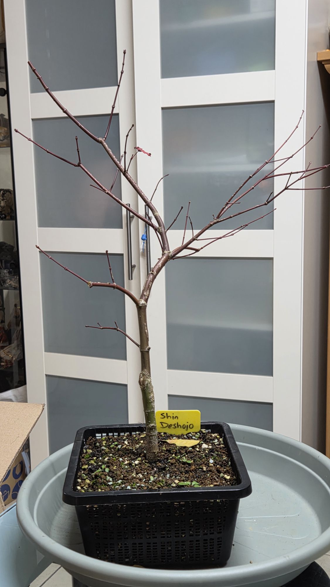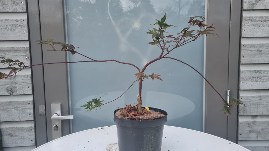 Met hulp van Paul een aantal Japanse esdoors bij Esveld gekocht om er bonsaiboompjes van te maken. Zo ook deze Shin Desjoho, de verbeterde versie van de populaire Desjoho. Dit boompje heeft prachtige rode bladeren als hij in de lente zijn blad opengooit.