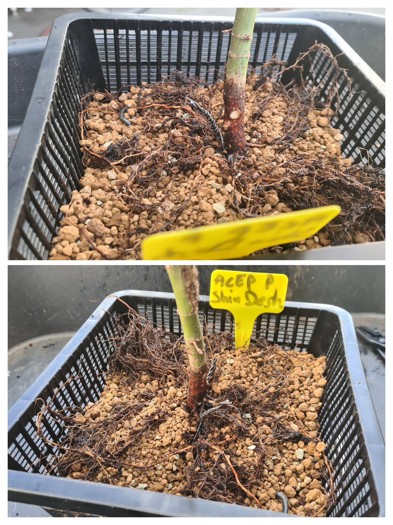 Deze Shin Desjoho is nog erg jong en dun. Toch alvast aan de wortelvoet gewerkt. De wortels zijn ook nog erg dun en flexibel. Daardoor is het lastig om het boompjes met draad vast aan de pot te binden.