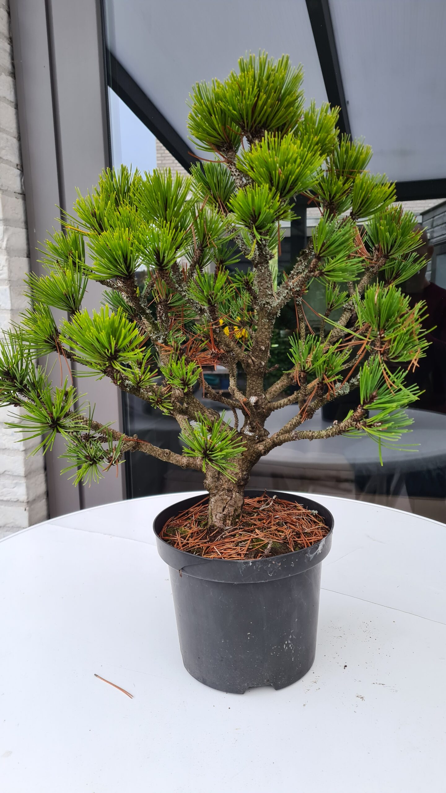 Vandaag kennisgemaakt bij Bonsaivereniging Zuid-Holland. Het was een werkmiddag voor naaldbomen. Ik heb mijn Pinus meegenomen en gezocht naar de wortelvoet. Dit blijkt een dikke knoop aan de rechterkant van de boom te zijn. Niet echt een Nibari.