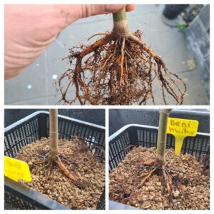 Het boompje verpot. De wortels zien er goed en evenwichtig verspreid uit. Dit kan een mooie Nebari worden in de toekomst.