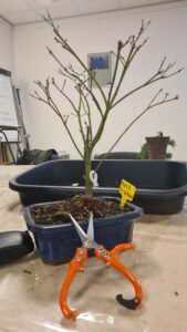 Dit is mijn eerste boompje dat ik verpot. Paula heeft uitgelegd hoe ik de wortels voorzichtig uit elkaar moet halen en moet inkorten.