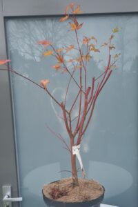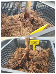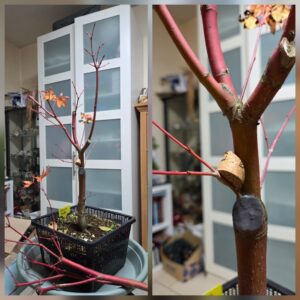 Met hulp van Paula weer een stapje gezet met dit boompje. Een dikke een zijtak die recht omhoog groeide verwijderd. Door deze tak te verwijderen is de vorm van de boom al enorm verbeterd. Wondpasta op de snijwond gedrukt en met een kurkje het takje dat in de oksel van de verwijderde tak groeide iets naar beneden gedrukt. Anders groeit deze ook recht omhoog.