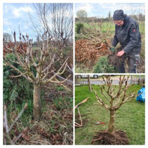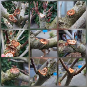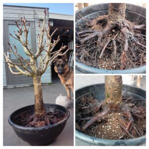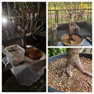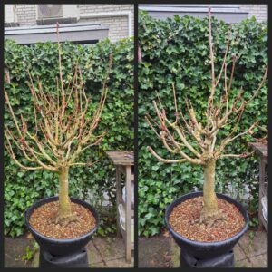 Deze kastanjeboom heeft jaren bij Iwan Roos in de volle grond gestaan. Al die jaren is hij kortgesnoeid en heeft hij inmiddels veel dode stompjes. Met de knobbeltang en met de dremel deze stompjes zo netjes mogelijk vlak gemaakt en gezorgd dat ik in de levende schors kwam. De schors zal daardoor Cambium aanmaken zodat de wonden kunnen dichtgroeien. Ik ben benieuwd hoe de wonden er over een jaar uitzien.