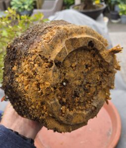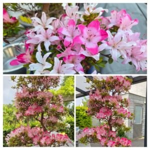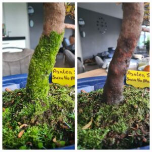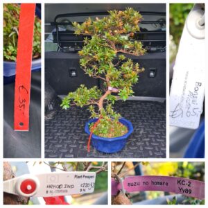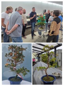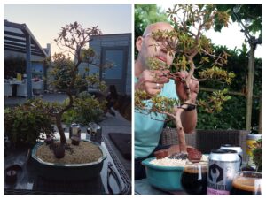 Tijdens de Azalea-cursus van 4 juni bij Lodder Bonsai in Harmelen had één van de mentoren, Alan, me geholpen met het vormsnoeien van het boompje. Nu was het tijd om de takken naar de goede posities te buigen met behulp van aluminiumdraad. Onder het genot van een lekker biertje en het toeziend oog van Ferry is het goed gelukt. Leuk om hieraan te werken.