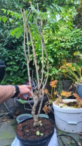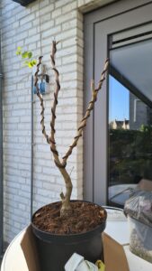 Tijdens de werkmiddag bij Bonsaivereniging Rijnmond deze Wisteria gesnoeid en bedraad. Corrie hielp me hierbij. We hebben 3 stammen overgehouden en wat beweging in de takken aangebracht.