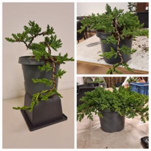 Dit boompje wat we met de cursus gevormd hebben, vandaag verpot. Bij Lodder had ik al een hoog potje gehaald. Er moest veel wortel verwijderd worden om hem van de kwekerspot in het bonsaipotje te krijgen.