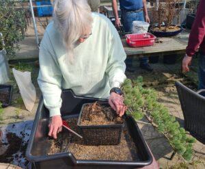 Vandaag stond “Bos maken” op het programma van de basiscursus. Aangezien ik mij eerst wil concentreren op het beheersen van de basistechnieken van bonsai, sta ik nog niet echt open voor het maken van een bos. Ik had dus lekker mijn Witte den meegenomen omdat die verpot moest worden om hem in een betere stand/positie te plaatsen. Corrie heeft me geholpen en we hebben hem in een vijvermandje gezet. De positie is nu meer cascade, dus de tak staat nu niet meer opzij maar meer schuin naar beneden. Daardoor kwam ook een deel van de wortelvoet boven de grond uit. Dat moet nu het komend jaar zijn functie gaan verliezen zodat dat stuk verwijderd kan worden.