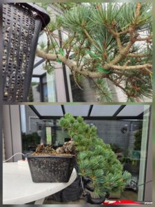 Corrie heeft me geholpen met het vormen van de witte den. Met spandraden hebben we de hoofdtak naar de pot toe getrokken zodat er veel meer beweging in zit en naar je toekomt als je de boom van voren bekijkt. De vorming van deze boom is een lang maar leuk traject. Ik ben al benieuwd naar de volgende stap.