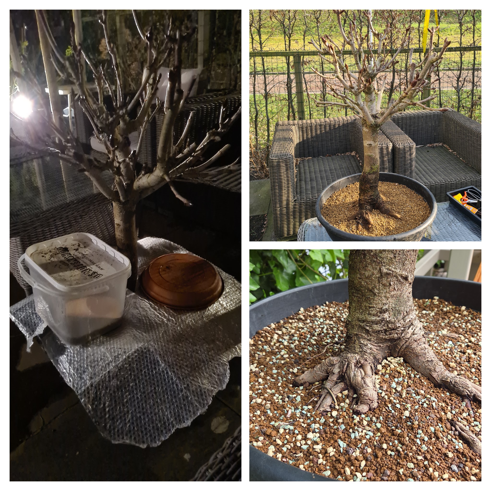 Thuis aangekomen met de kastanjeboom heb ik alle aarde van de wortels afgespoten met de tuinslang en de wortels nog een beetje gecorrigeerd. Onderin de schaal heb ik een laagje hydrokorrels gelegd en daar bovenop de mix van Akadama en Vulkastrat. De boom erop gezet en de wortels goed vastgezet met ijzerdraad. Na het afvullen de schaal goed gespoeld zodat alle stof van de mix eruit liep.