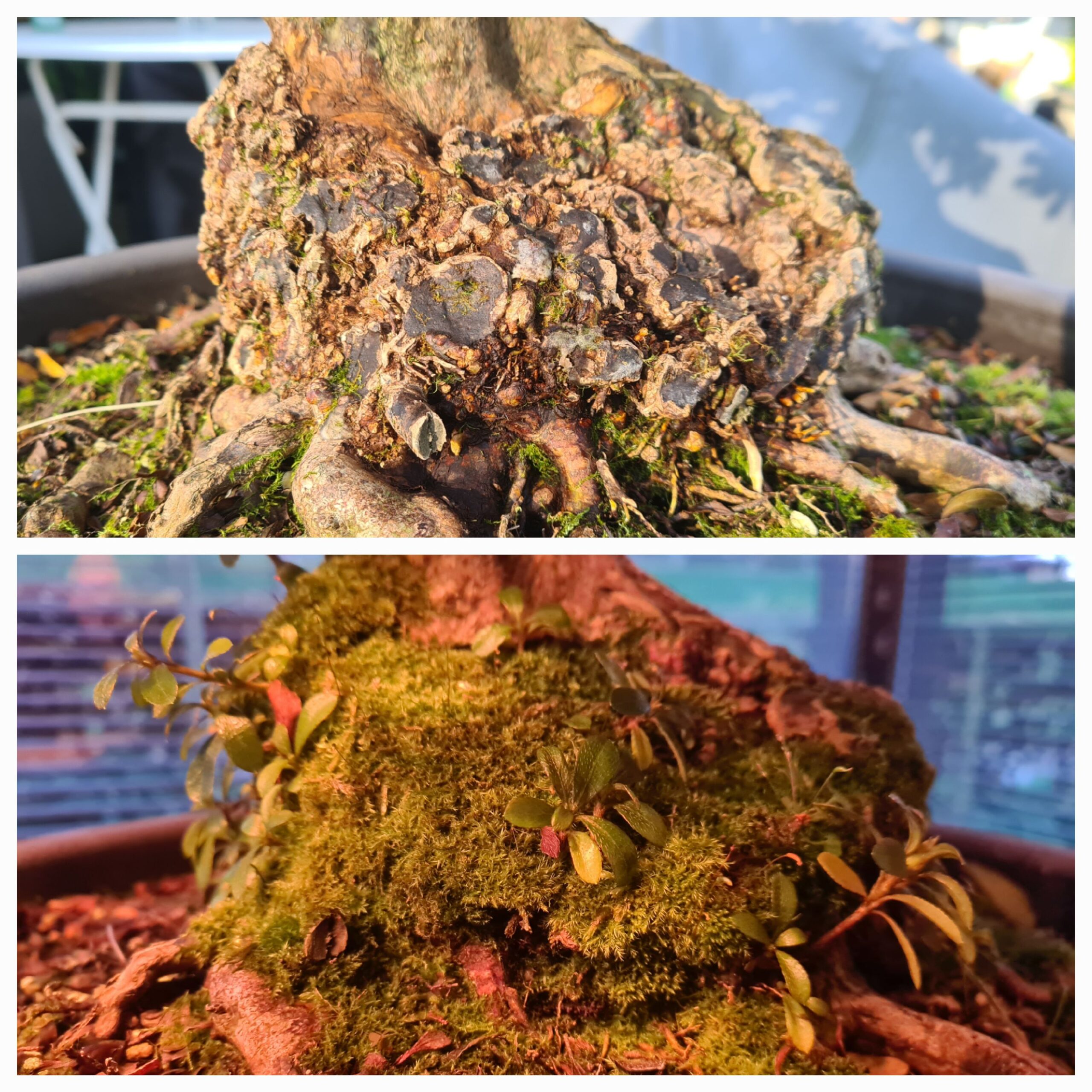 Met een pincet zoveel mogelijk het mos verwijderd en daarna met een tandenborstel schoongeboend. Je kan duidelijk zien dat aan de achterkant van de boom gekozen is om offertakken te laten groeien om de wortelvoet dikker te maken. Het zit vol met lidtekens.