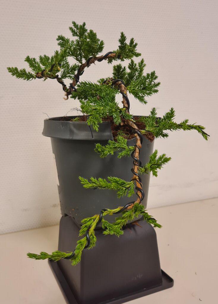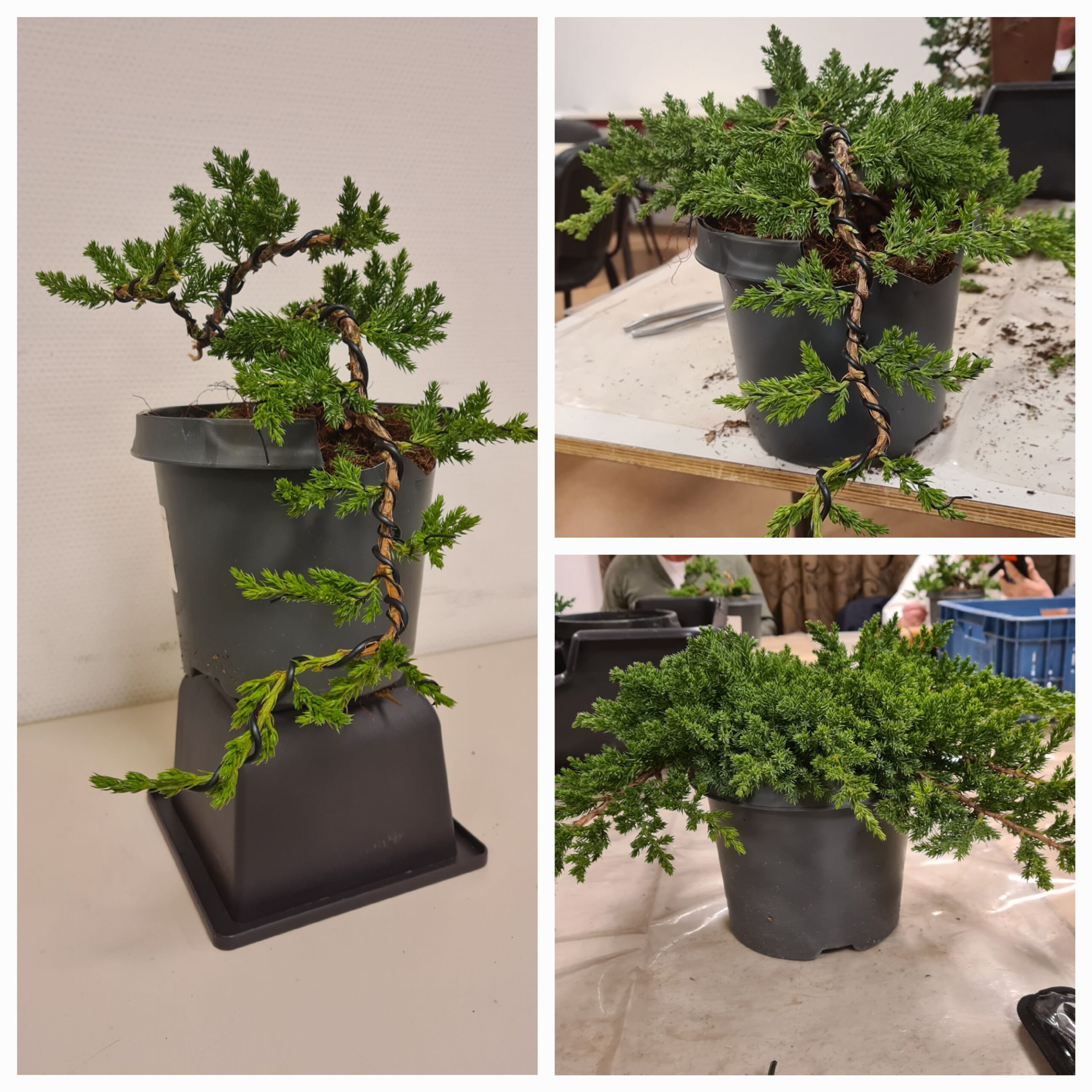 Tijdens de basiscursus bonsai bij Bonsaiverenging Rijnmond een leuke en leerzame les gehad van Gino. We hebben een simpele jeneverbes van het tuincentrum omgetoverd tot een leuk jong bonsaiboompje. Eerst bovenste laag aarde verwijderd en de stam helemaal vrijgemaakt van “blad”. Daarna een lange hoofdtak uitgekozen en die in cascadevorm naar beneden gebogen. Op de lange tak laat je om en om een takje naar links en rechts staan.