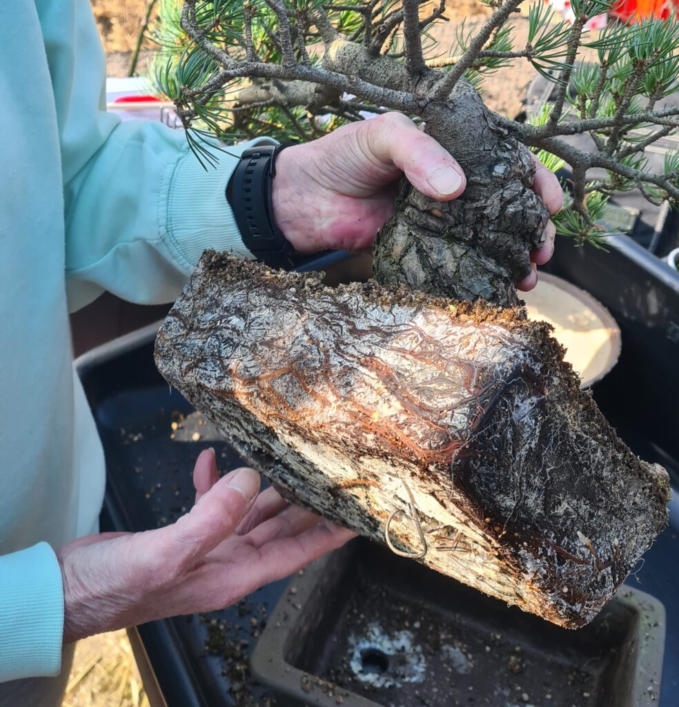 Voor 0800h zat ik al in de auto om naar de uitverkoop van Bonsai Plaza te gaan. Ik heb daar 5 uur rondgelopen, gepraat, gevraagd en geleerd. Deze Witte Den gekocht omdat hij een mooie cascade heeft en een dikke wortelvoet (geënt op de zwarte den).